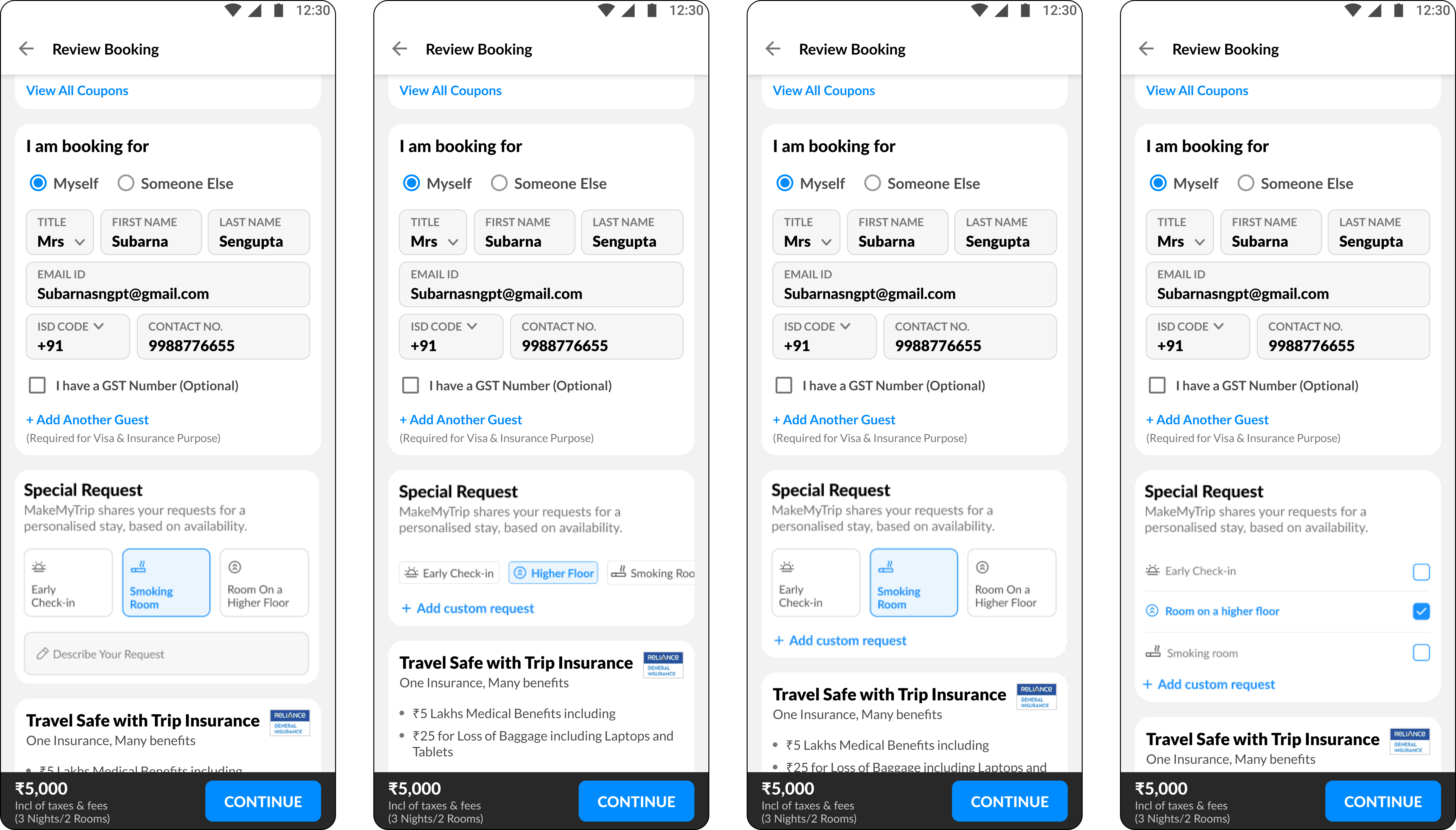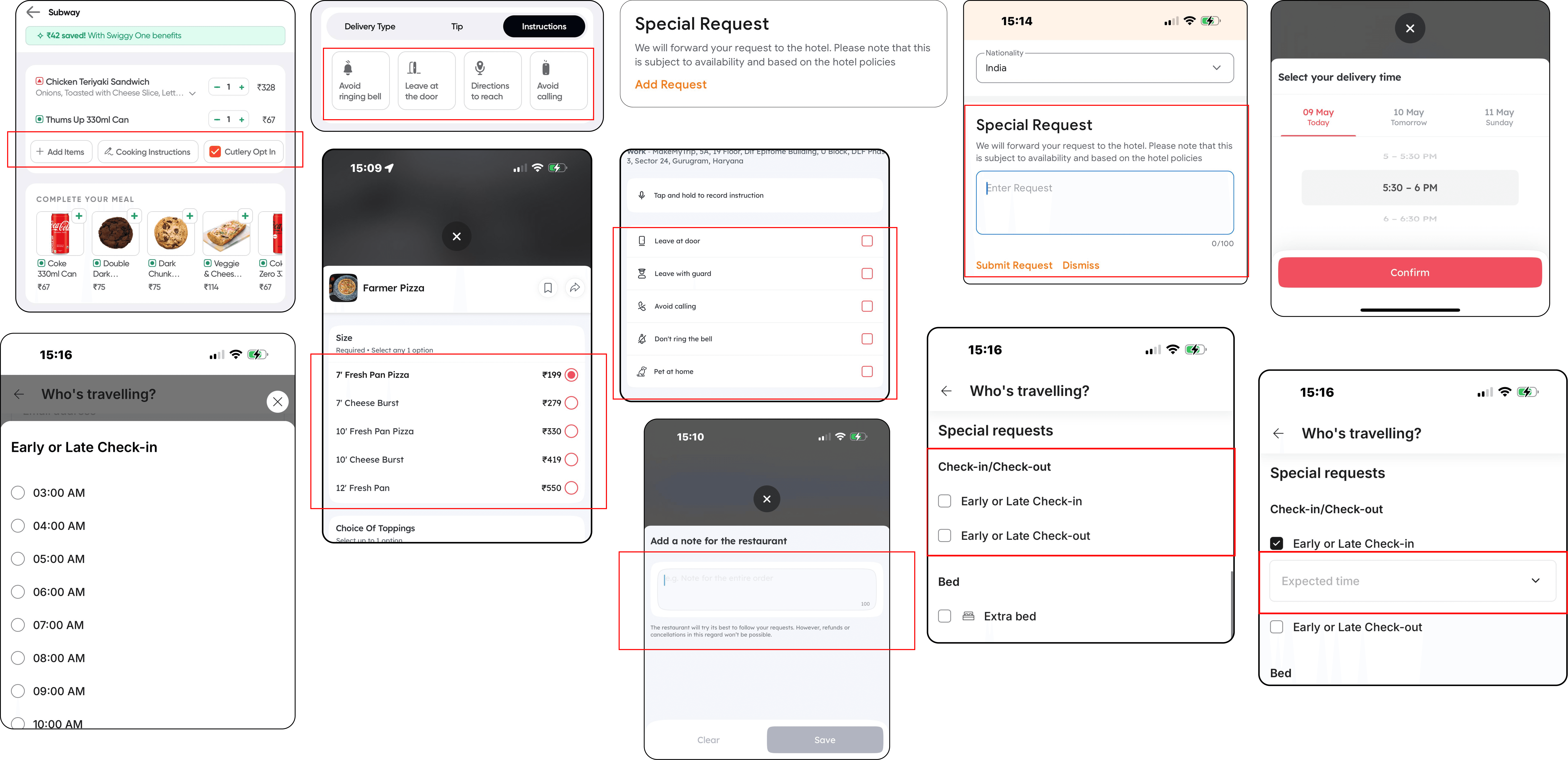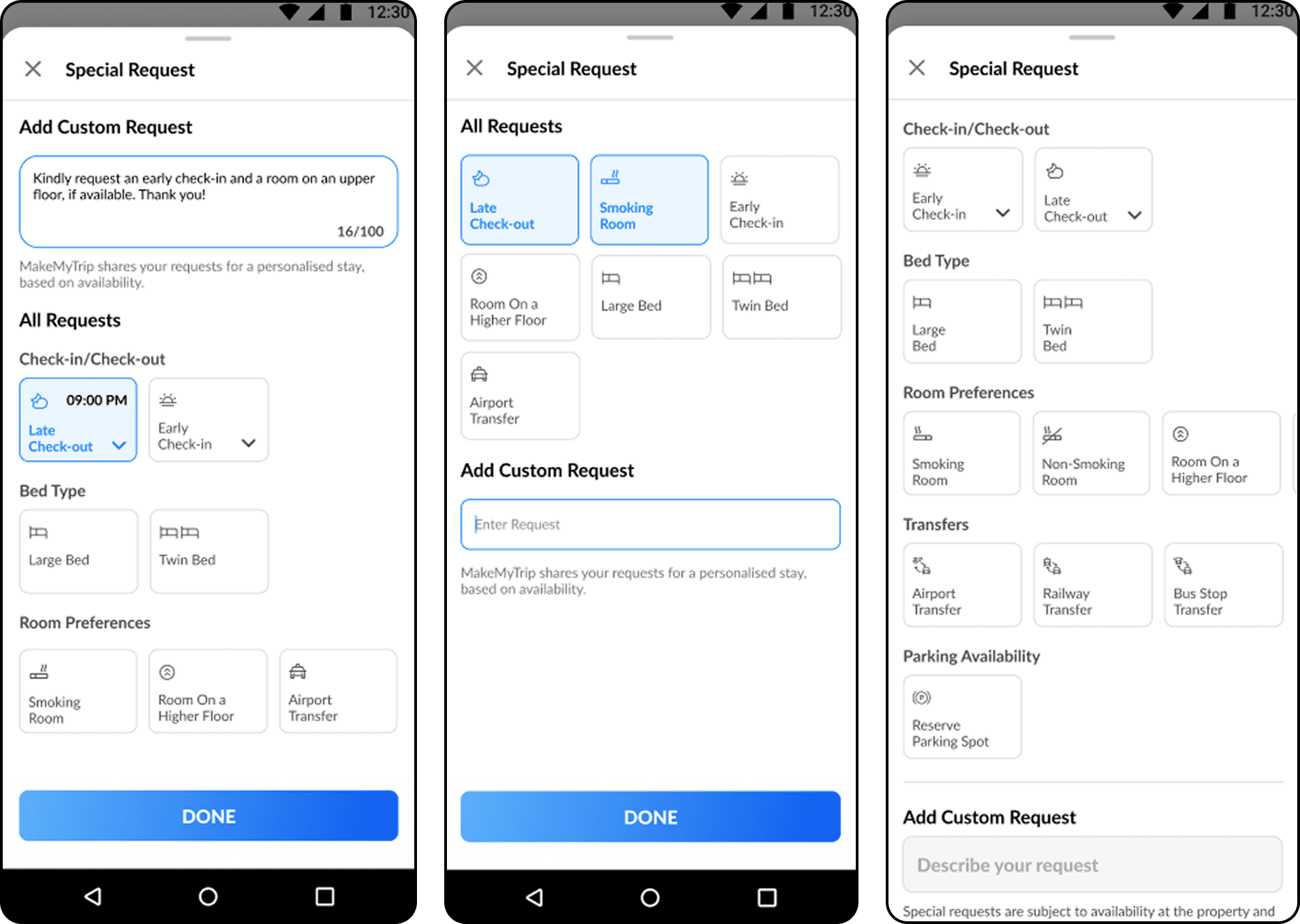 Custom Requests CTA: To solve free-text input issues—keyboard overlap and bloated card height—a clear “Add Custom Request” CTA was introduced. Standard and custom requests were now separated, improving usability without overloading the card.