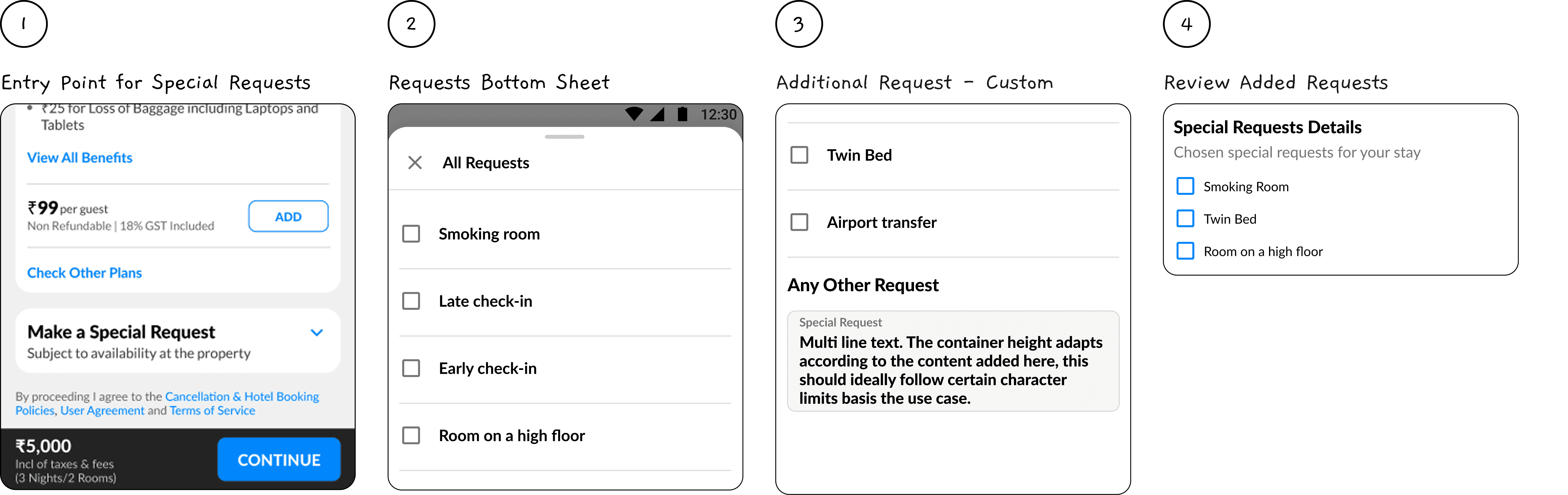 The upfront Special Request card evolved through multiple iterations to strike the right balance between visibility, usability, and compactness.