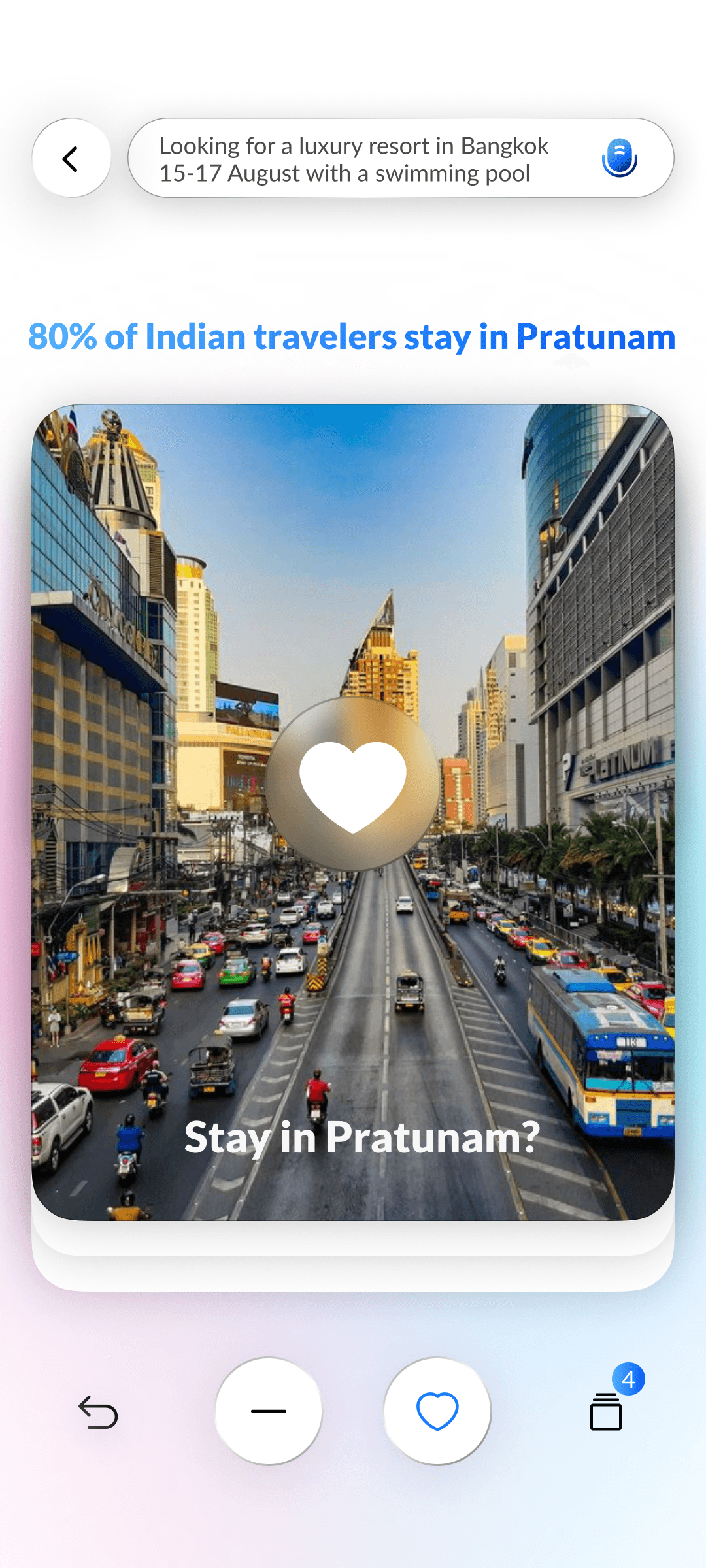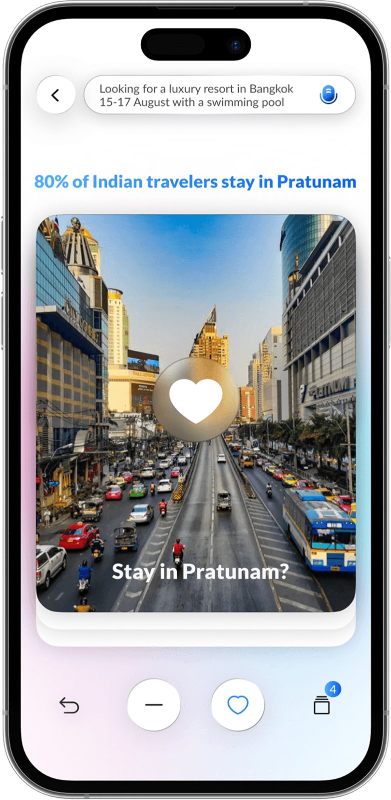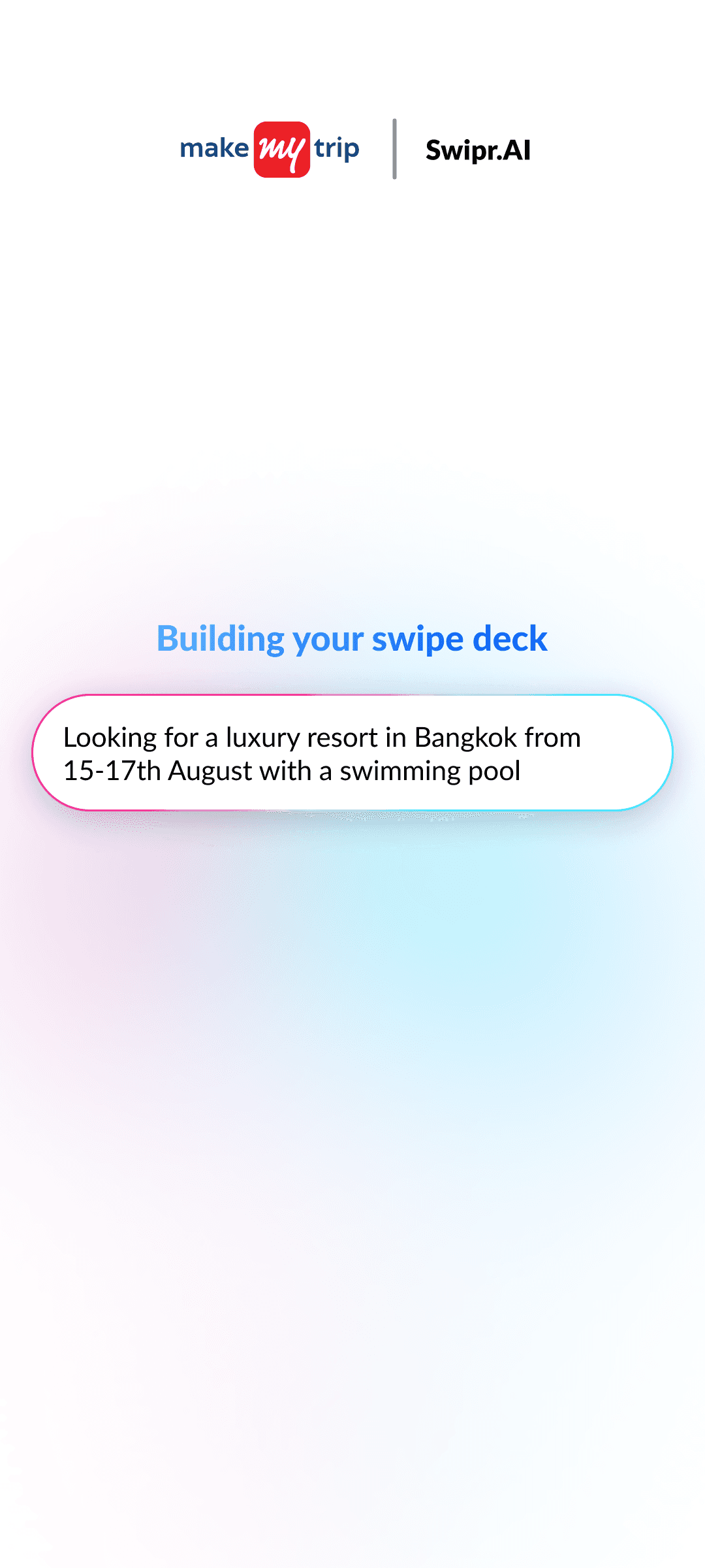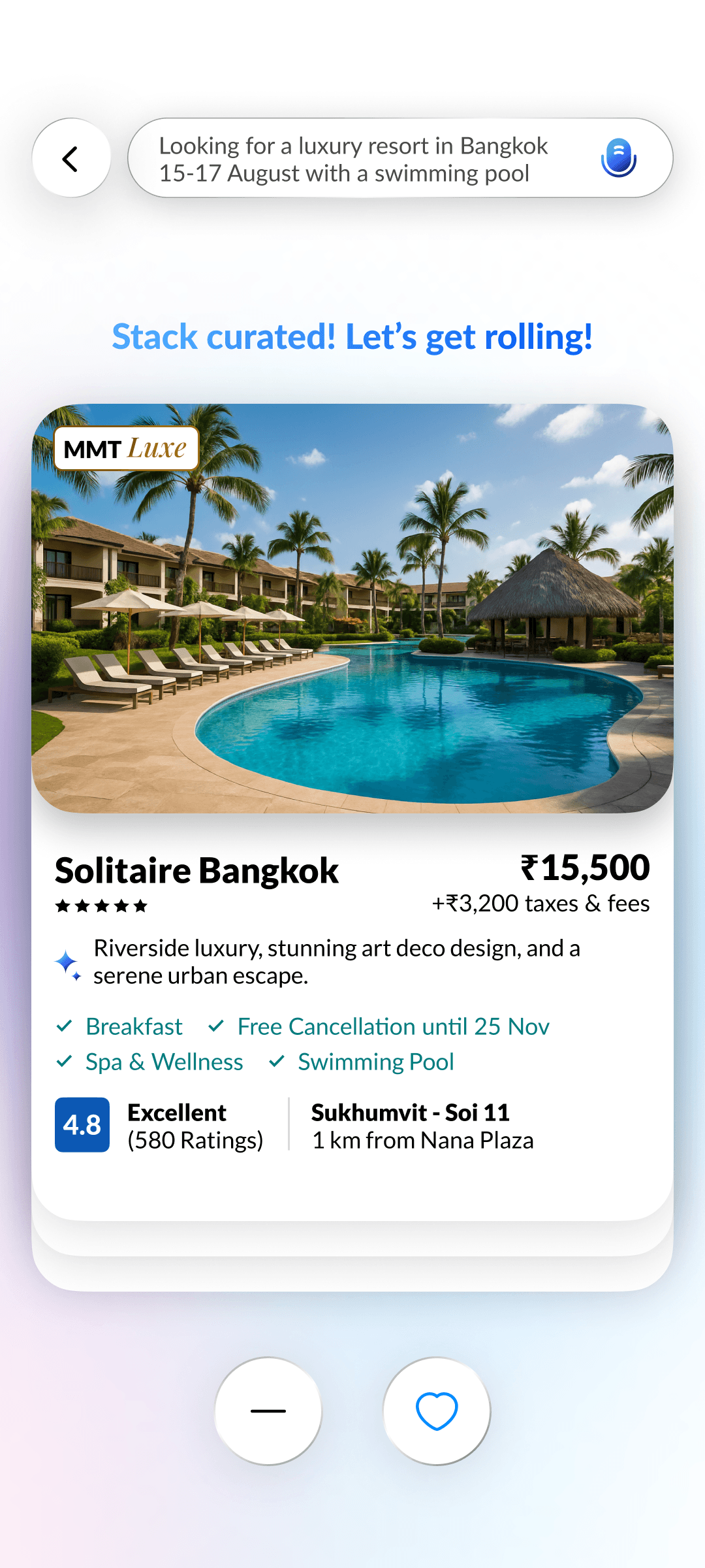 AI builds a natural language search prompt from your inputs, learning preferences with every swipe for hyper-relevant hotel results.