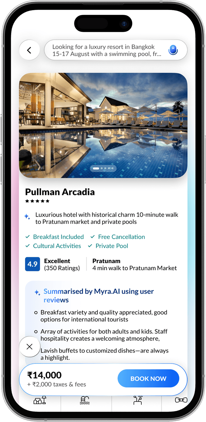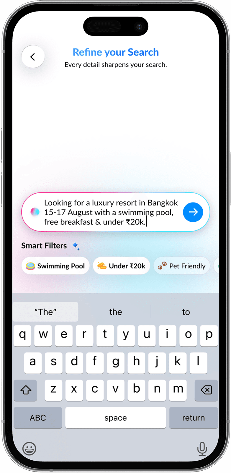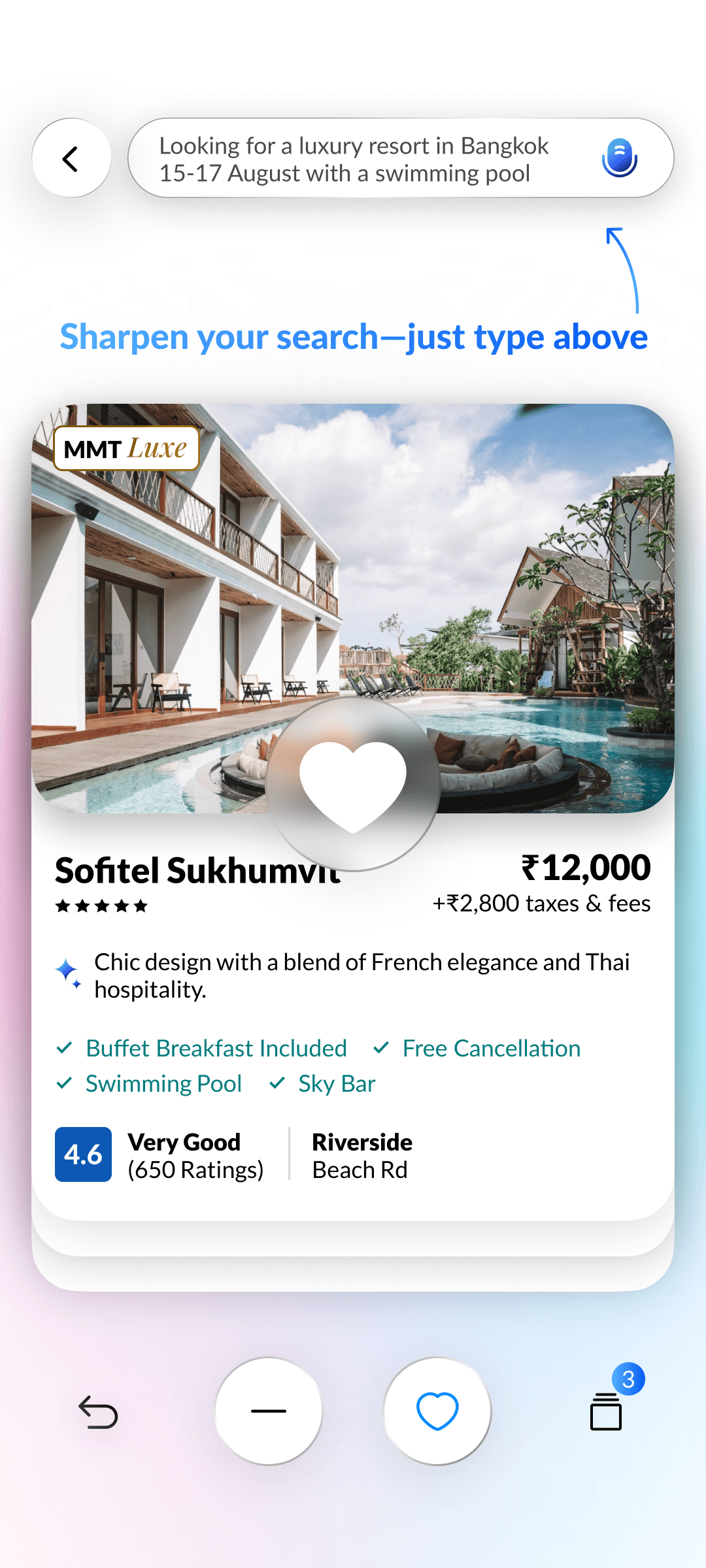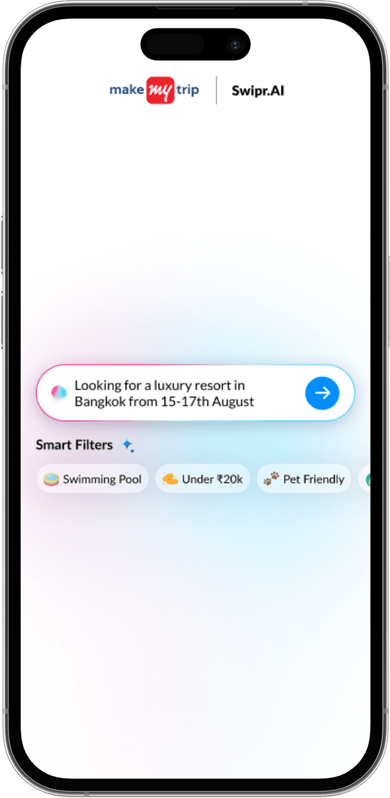 AI builds a natural language search prompt from your inputs, learning preferences with every swipe for hyper-relevant hotel results.