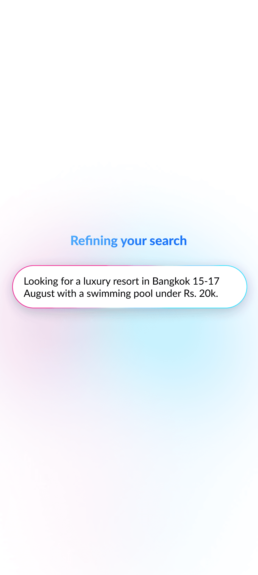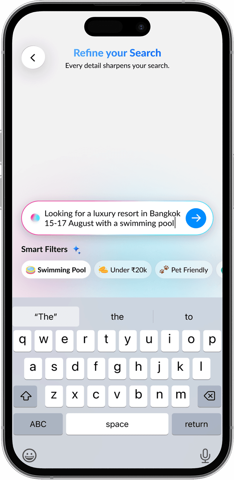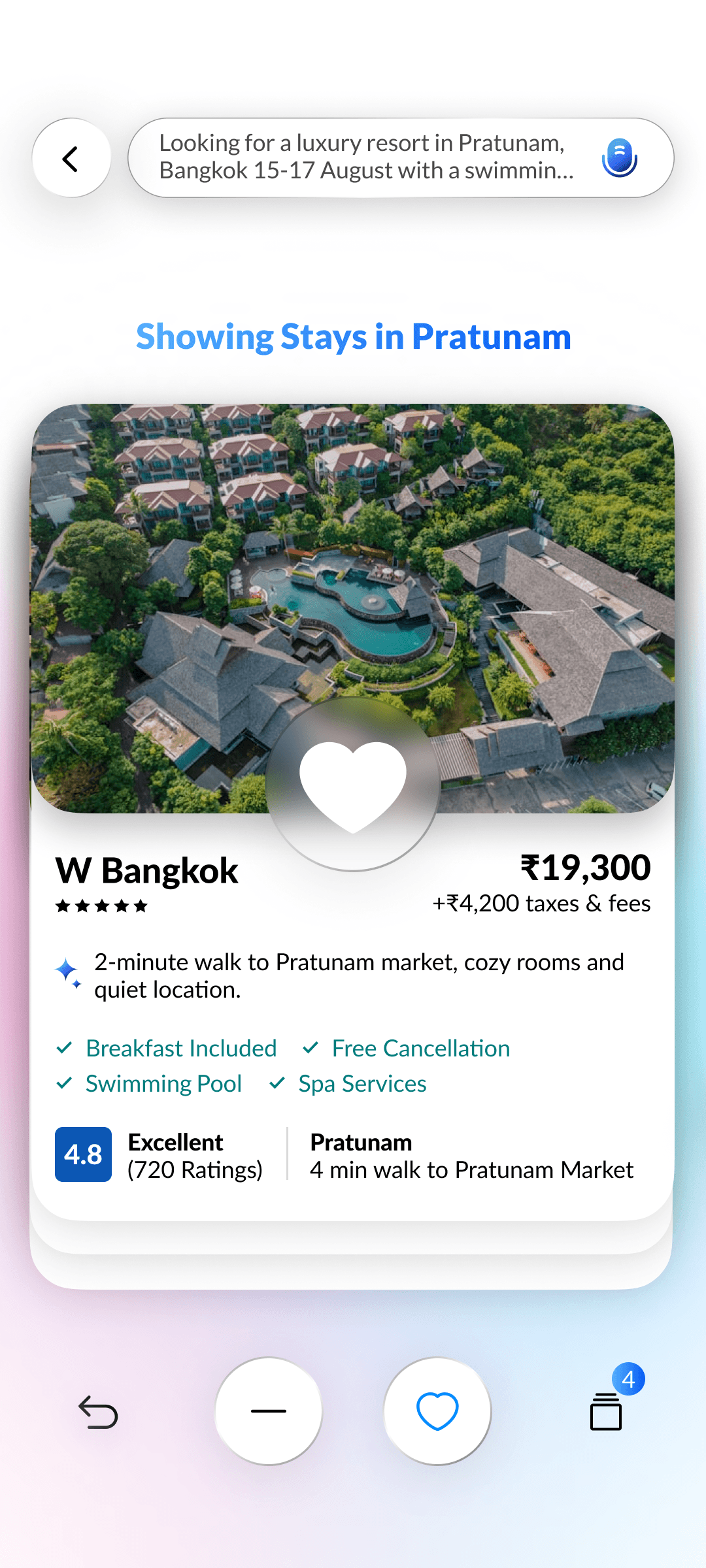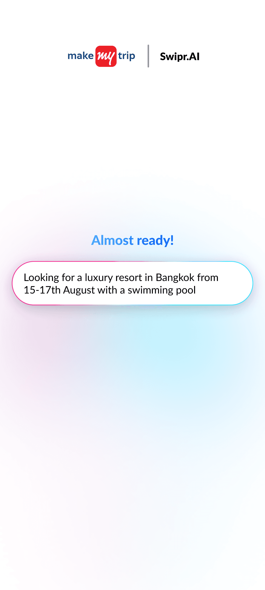 AI builds a natural language search prompt from your inputs, learning preferences with every swipe for hyper-relevant hotel results.