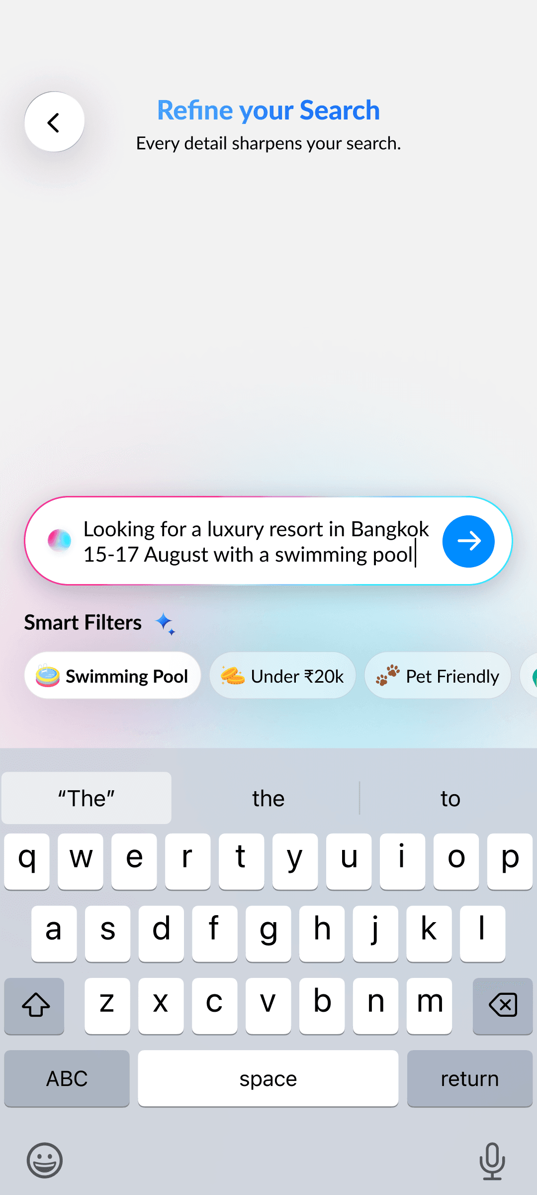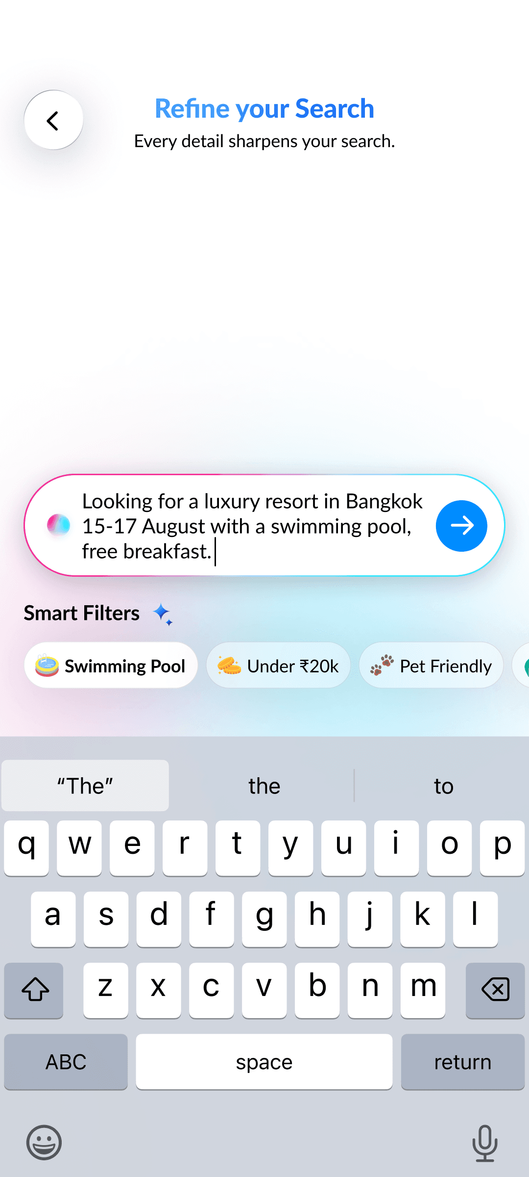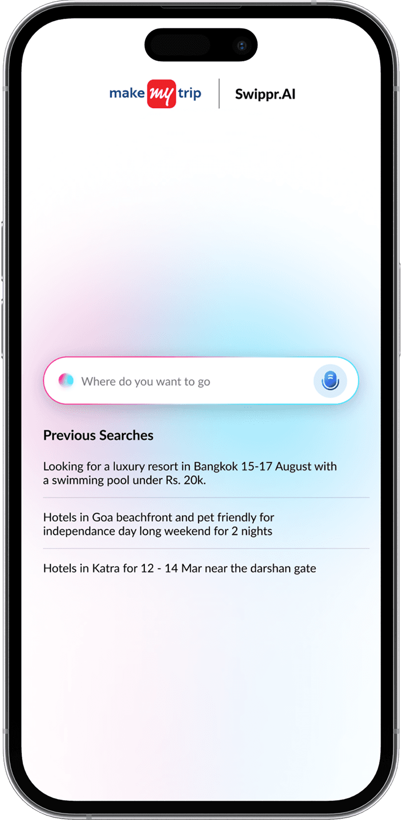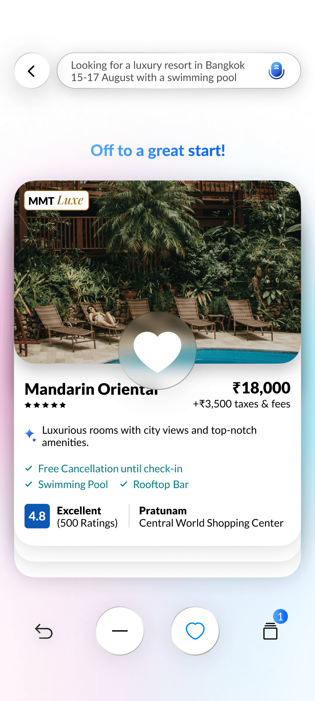 AI builds a natural language search prompt from your inputs, learning preferences with every swipe for hyper-relevant hotel results.