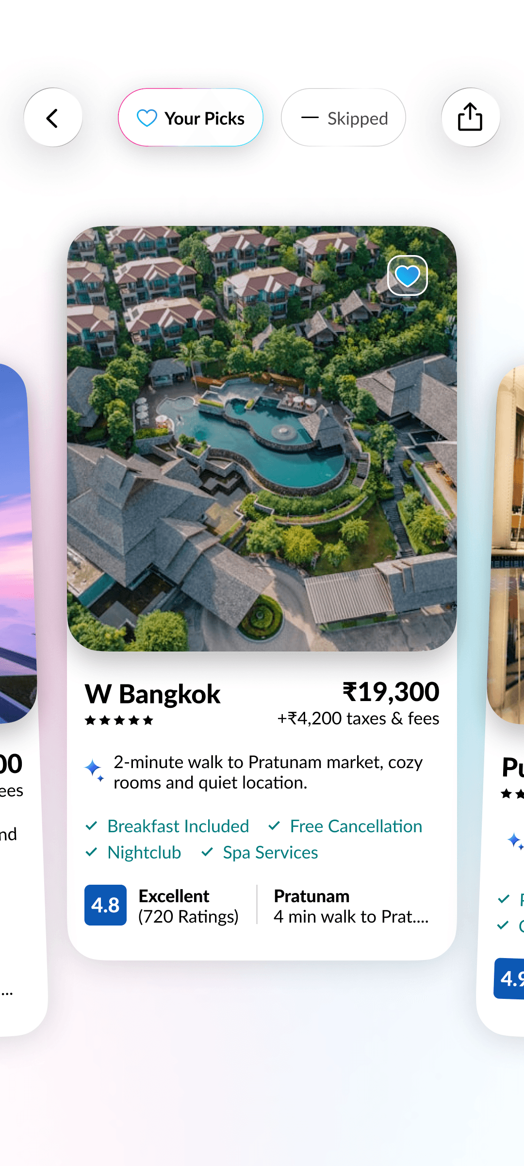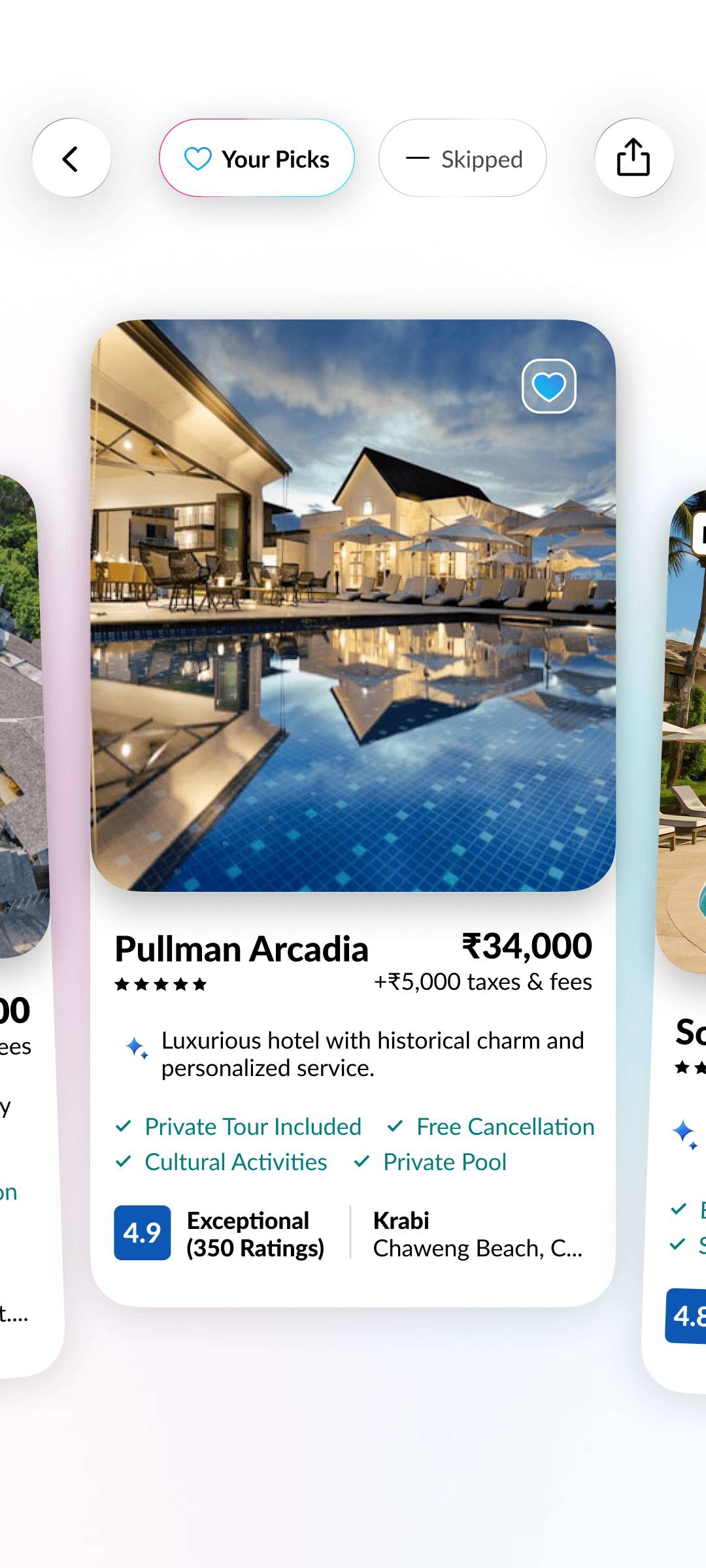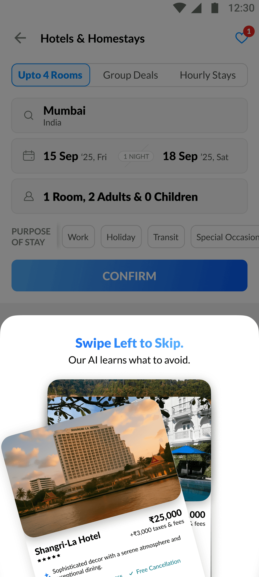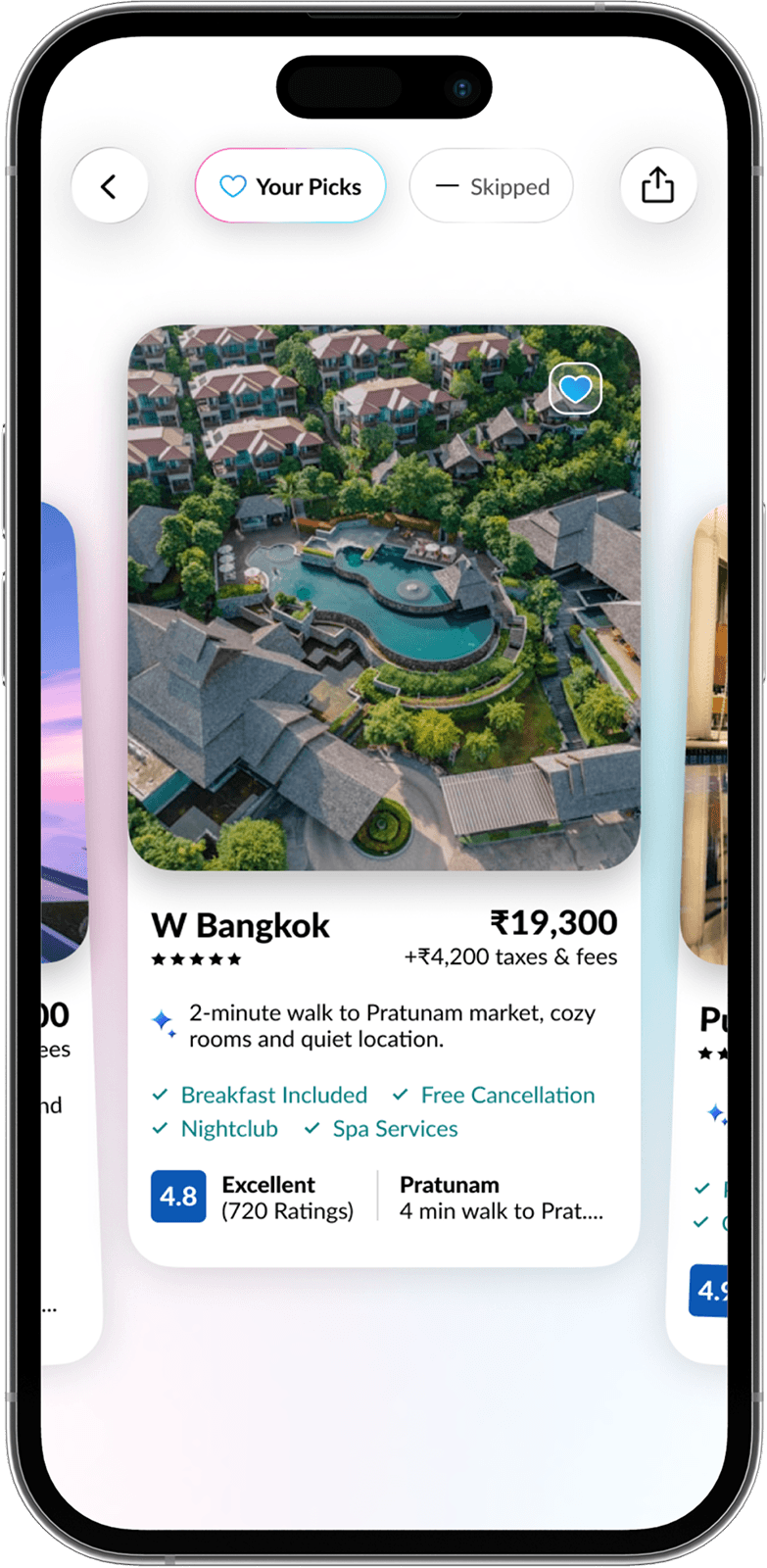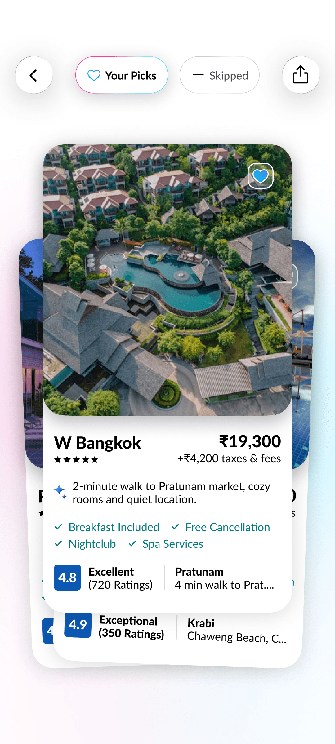 The swipe engine instantly adapts to your likes and dislikes, re-ranking hotels on the fly for smarter, more relevant suggestions.
