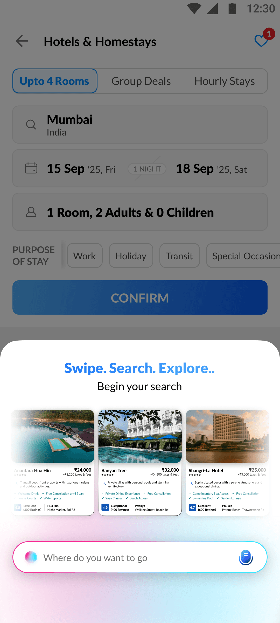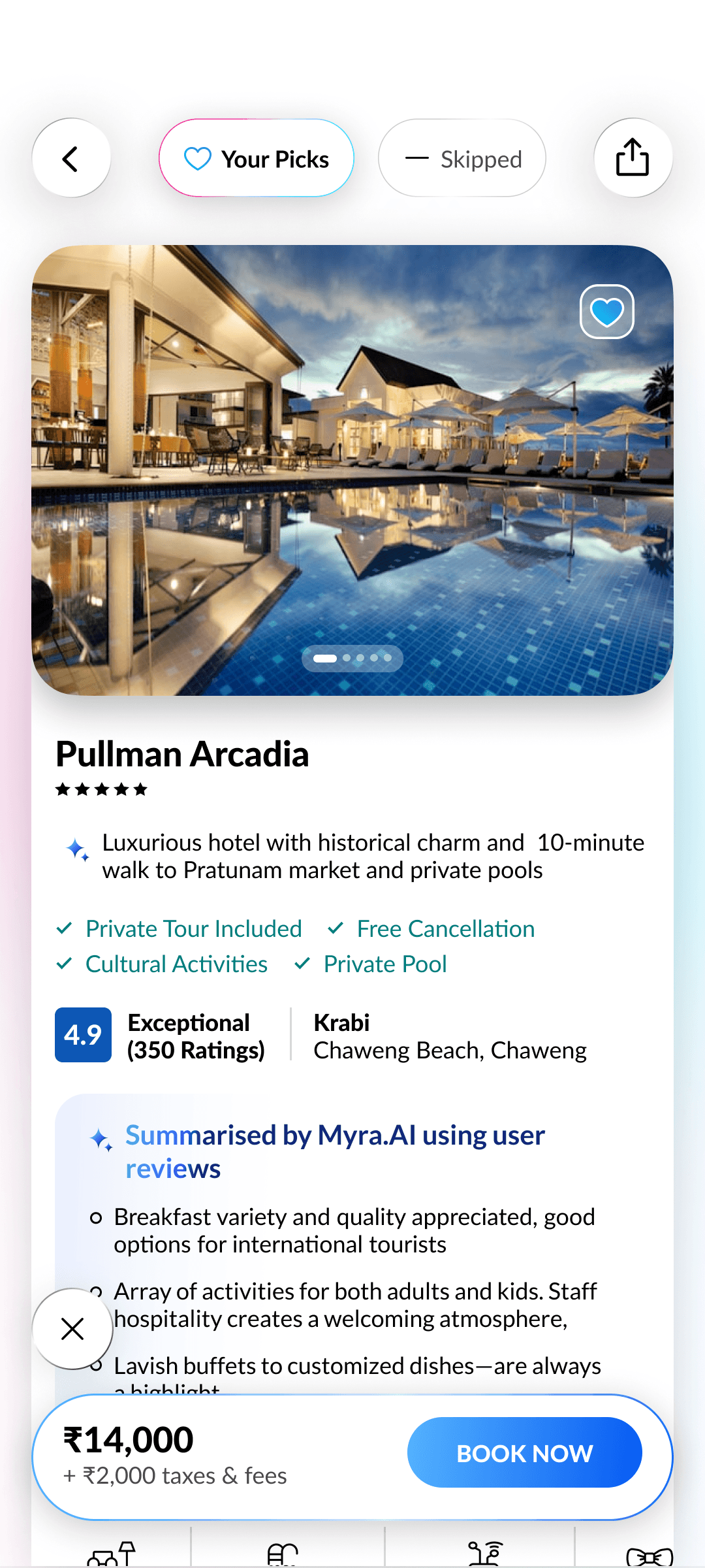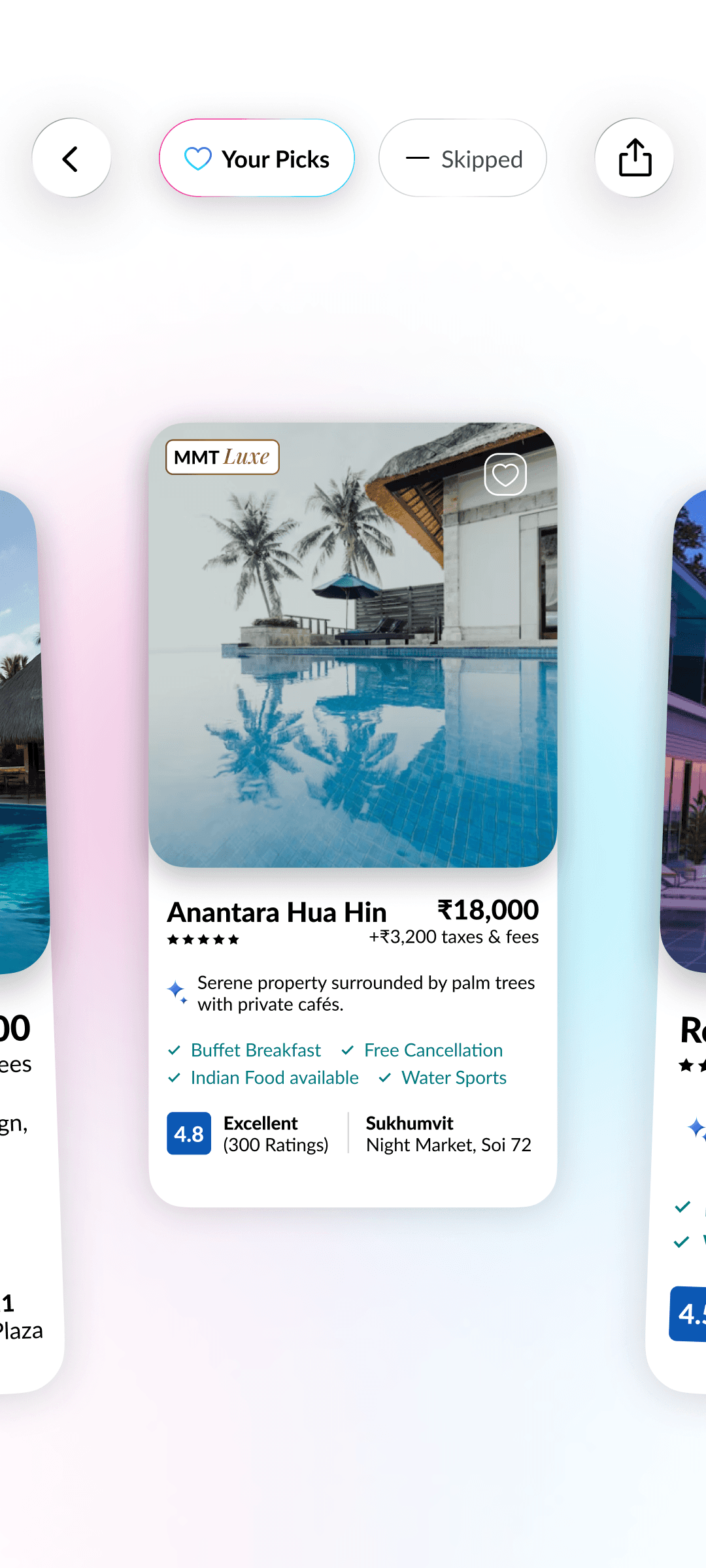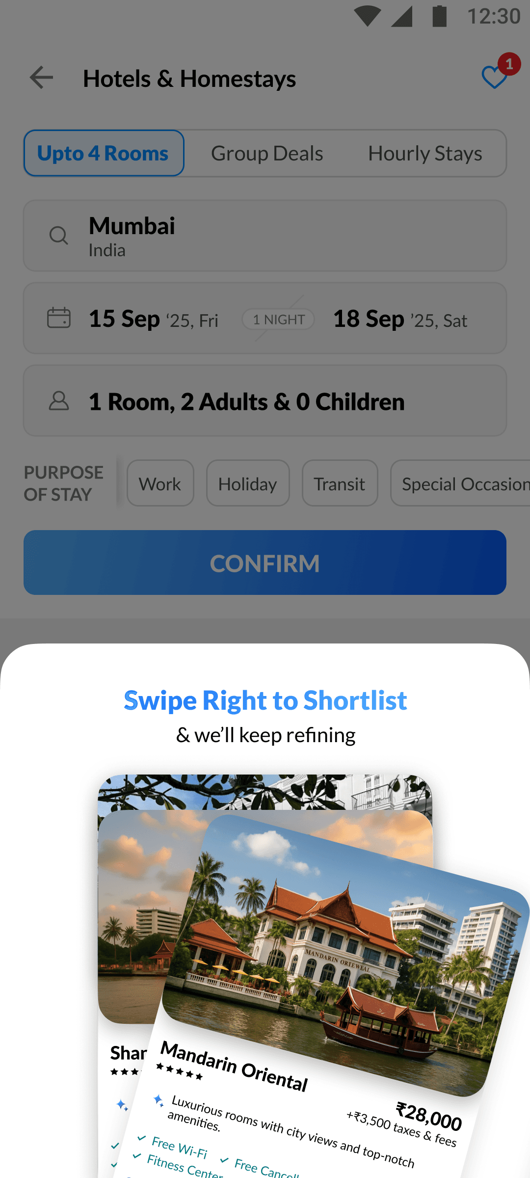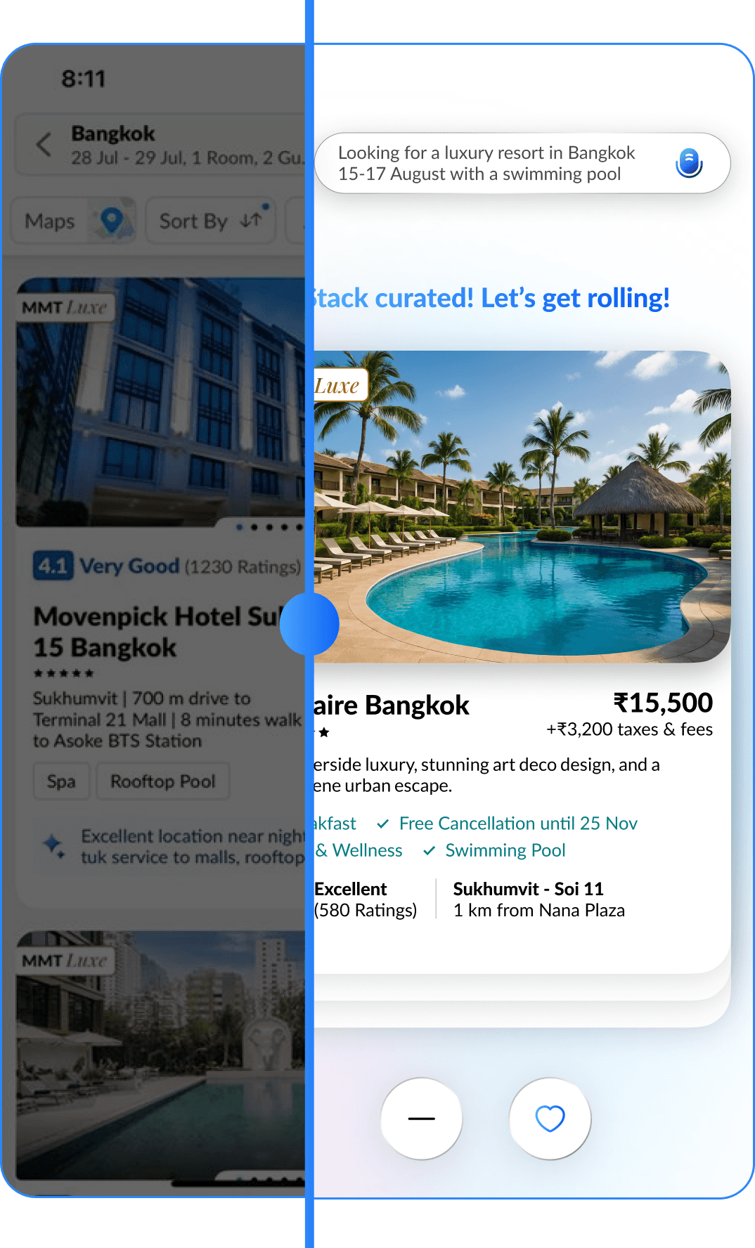 The swipe engine instantly adapts to your likes and dislikes, re-ranking hotels on the fly for smarter, more relevant suggestions.