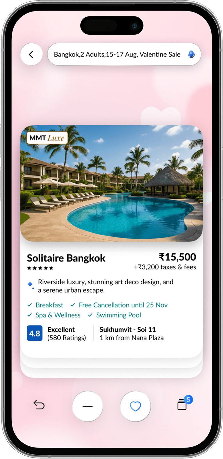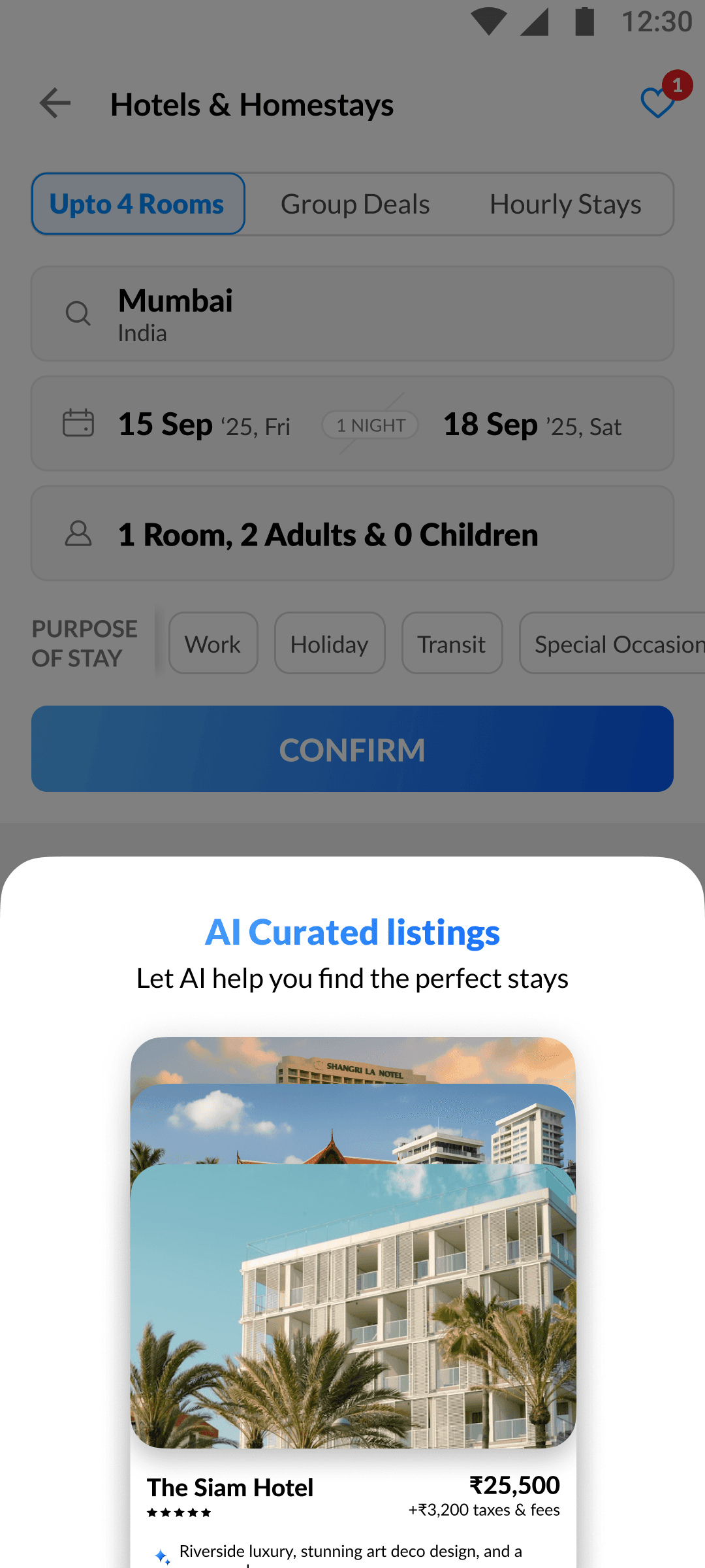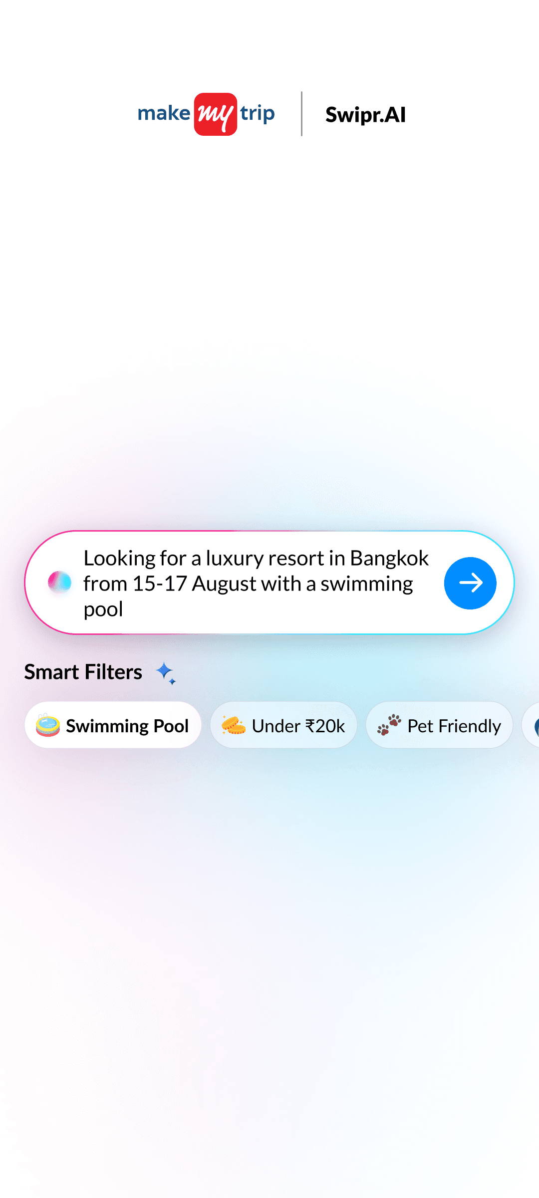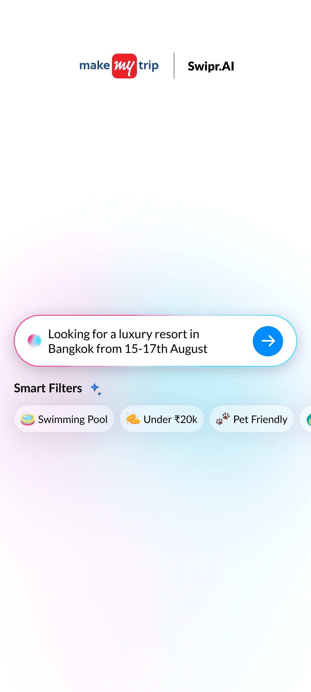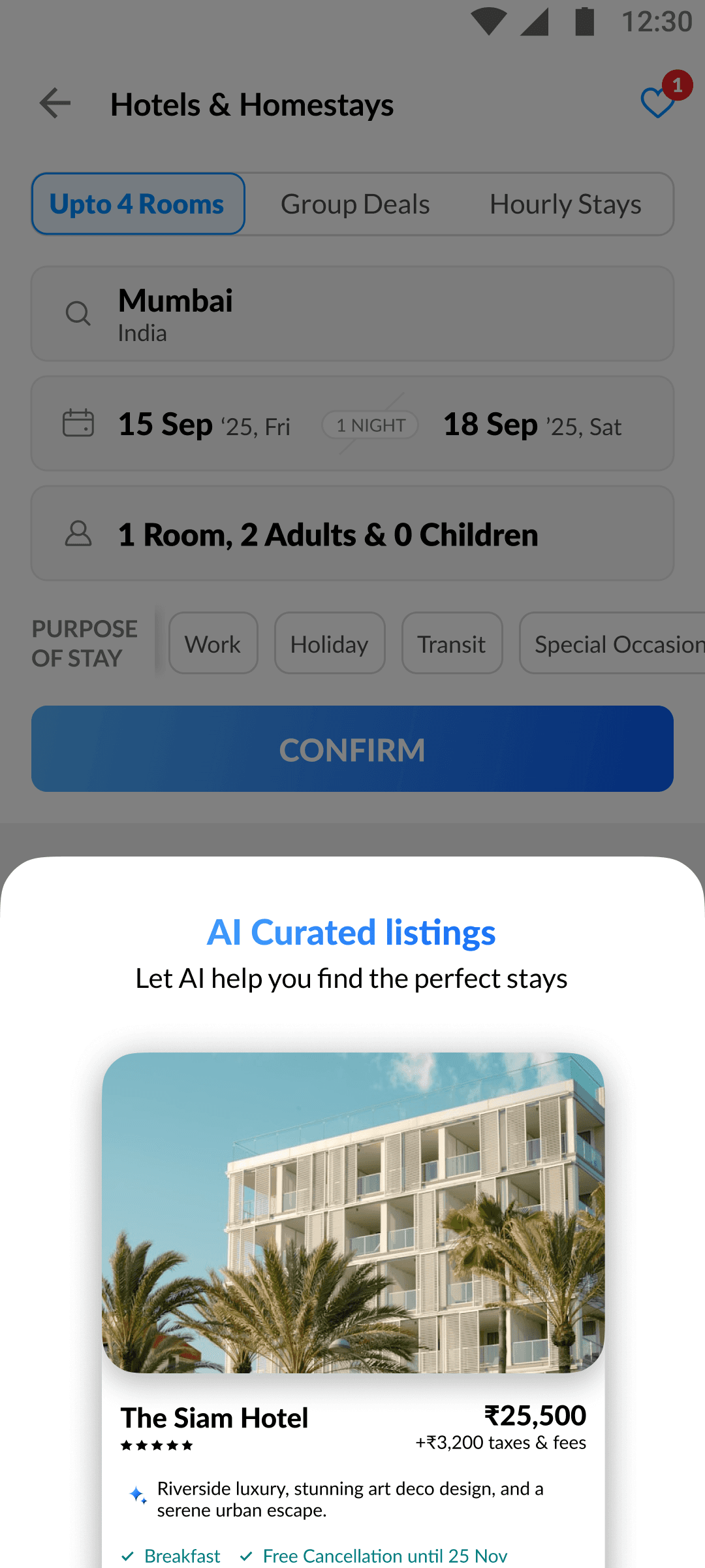 The swipe engine instantly adapts to your likes and dislikes, re-ranking hotels on the fly for smarter, more relevant suggestions.