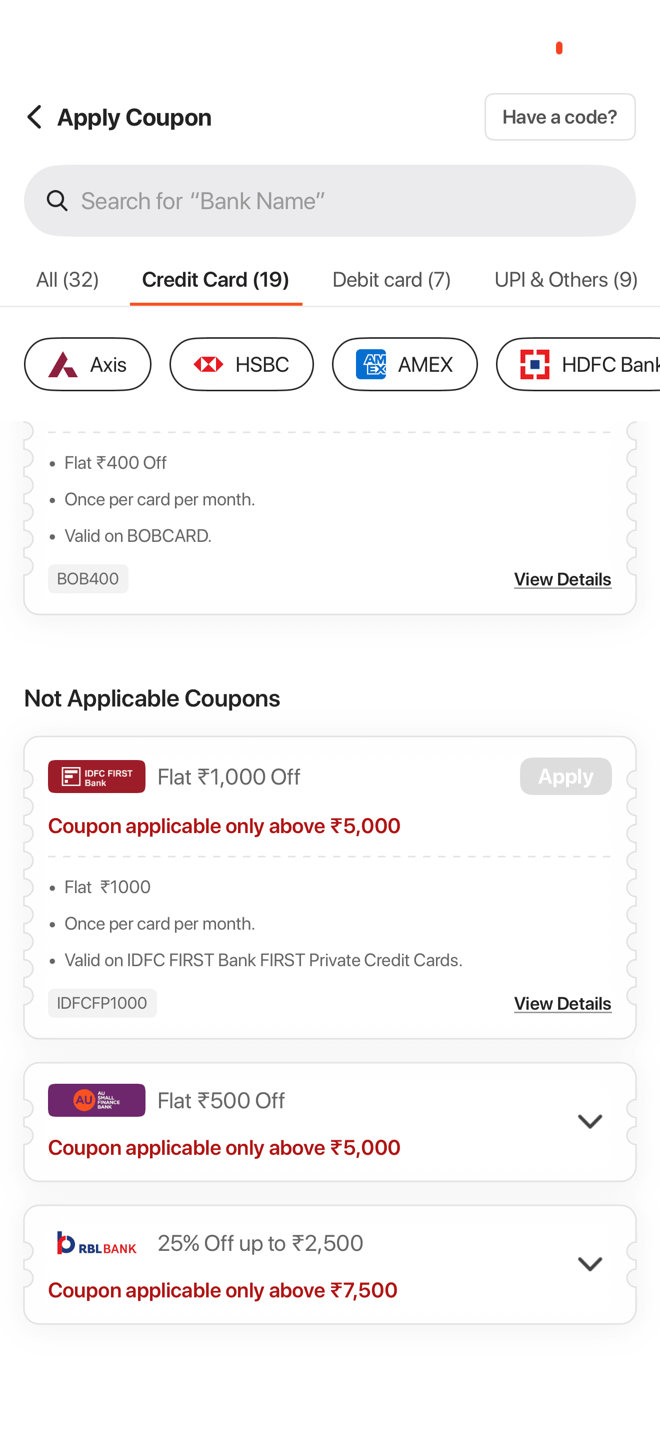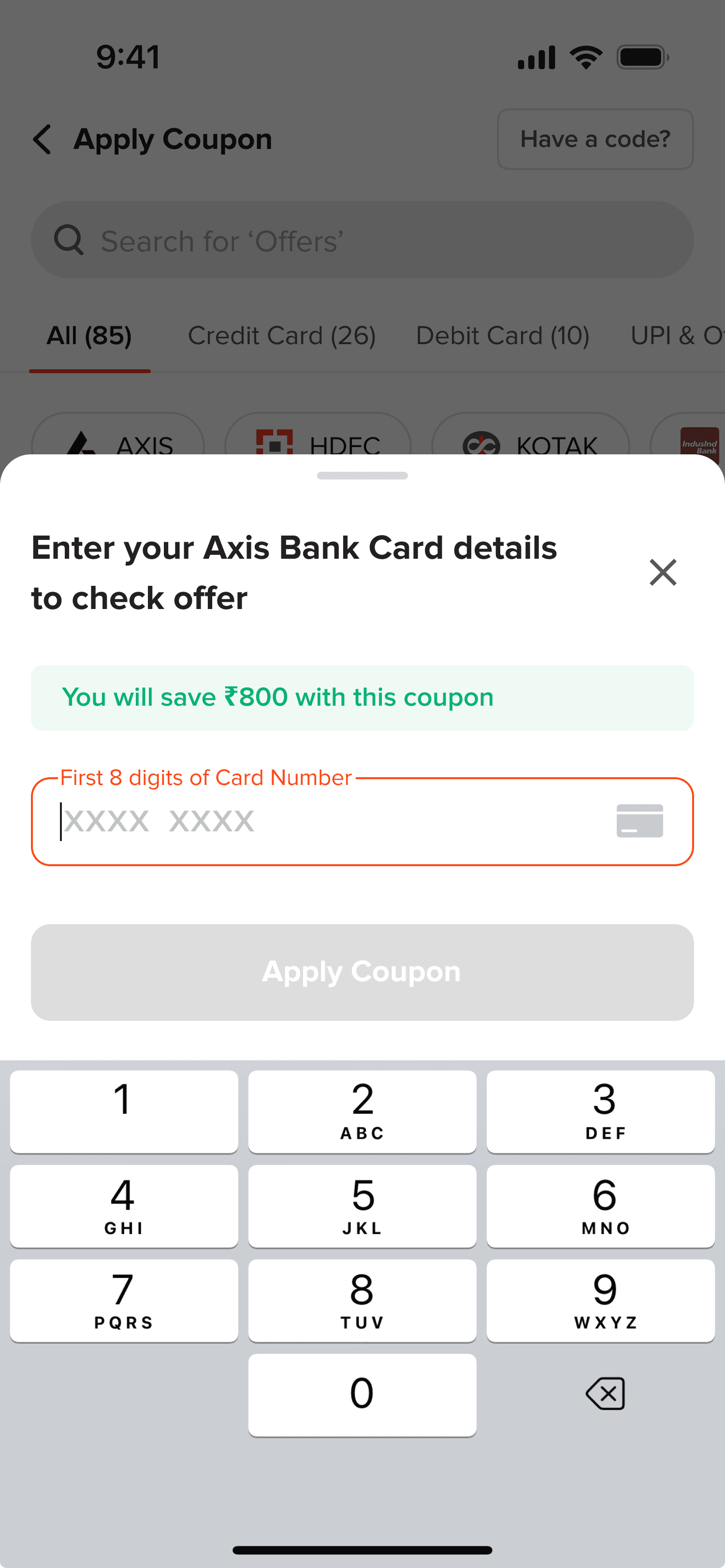 Enter your Axis bank card details to instantly confirm your eligible discount.